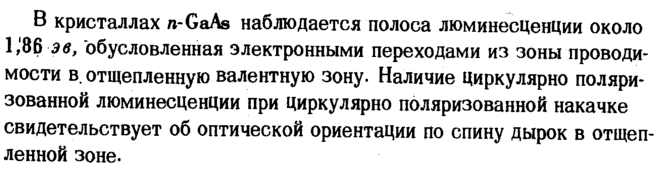 В кристаллах n-GaAs наблюдается полоса люминесценции около 1,'86 эв, "обусловленная электронными переходами из зоны проводимости в. отщепленную валентную зону. Наличие Циркулярно поляризованной люминесценции при Циркулярно поляризованной накачке свидетельствует об оптической ориентации по спину дырок в отщепленной зоне.