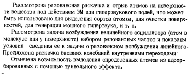Рассмотрена резонансная раскачка и отрыв атомов на поверхности вещества под действием ЭМ или гиперзвукового полей, что может быть использовано для выделения сортов атомов, для очистки поверхностей, для генерации мошного гиперзвука, и т. п. Рассмотрена задача возбуждения нелинейного осциллятора (атом в молекуле или у поверхности) набором резонансных частот и показаны условия сведения ее к задаче о резонансном возбуждении линейного. Предложена раскачка внешних колебаний внутренними переходами Отмечена возможность выделения определенных атомов из адсорбированных с помошью туннельного эффекта.