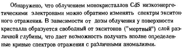 Обнаружено, Что облучением монокристаллов CdS низкоэнергетическими электронами можно обратимо изменять спектры экситон-ного отражения. В зависимости от дозы облучения у поверхности кристалла образуется свободный от экситонов ("мертвый") слой различной глубины, Что дает возможность получать вполне определенные кривые спектров отражения с различными аномалиями.