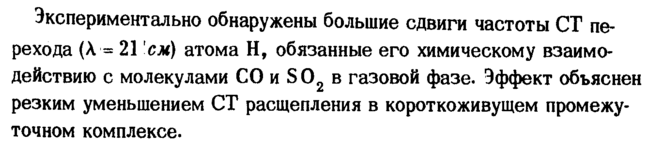 Экспериментально обнаружены большие сдвиги частоты СТ перехода (λ 21 см) атома Н, обязанные его химическому взаимодействию с молекулами СО и S02 в газовой фазе. Эффект объяснен резким уменьшением СТ расщепления в короткоживущем промежуточном комплексе.