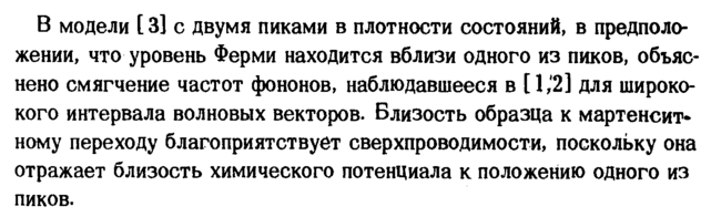 В модели [ 3] с двумя пиками в плотности состояний, в предположении, что уровень Ферми находится вблизи одного из пиков, объяснено смягчение частот фононов, наблюдавшееся в [1,'2] для широко-кого интервала волновых векторов. Близость образца к мартенсит-ному переходу благоприятствует сверхпроводимости, поскольку она отражает близость химического потенциала к положению одного из пиков.