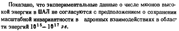 Показано, Что экспериментальные данные о числе мюонов высокой энергии в ШАЛ не согласуются с предположением о сохранении масштабной инвариантности в адронных взаимодействиях в области энергий 1015—1017 эв.