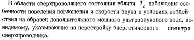 В области сверхпроводящего состояния вблизи Τ наблюдены особенности поведения поглощения и скс^рости звука в условиях воздействия на образец дополнительного мощного ультразвукового поля, по-видимому, указывающие на перестройку энергетического спектра сверхпроводника.