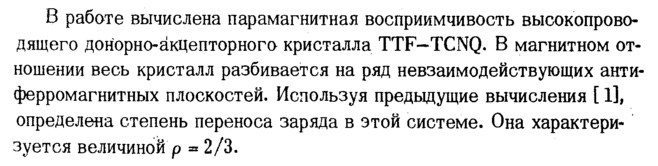 В работе вычислена парамагнитная восприимчивость высокопрово-дящего донорно-акцепторного кристалла TTF— TCNQ. В магнитном отношении весь кристалл разбивается на ряд невзаимодействующих антиферромагнитных плоскостей. Используя предыдущие вычисления [ 1], определена степень переноса заряда в этой системе. Она характери' зуется величиной ρ » 2/3.