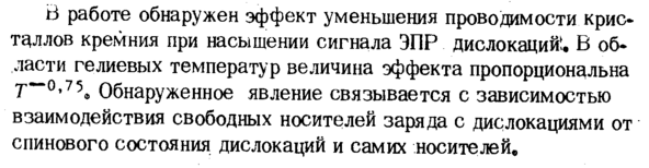 В работе обнаружен эффект уменьшения проводимости крис» тзллов кремния при насыщении сигнала ЭПР дислокаций, В области гелиевых температур величина эффекта пропорциональна Т~~°'75в Обнаруженное явление связывается с зависимостью взаимодействия свободных носителей заряда с дислокациями от спинового состояния дислокаций и самих носителей,,