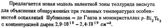 Предлагается новая модель валентной зоны теллурида висмута для объяснения обнаруженных при гелиевых температурах особенностей осцилляций Шубникова — де Гааза в монокристаллах P-Bi2Te3 с концентрацией дырок 2,9-1018 2,4·. 1019 см~*.