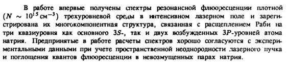 В работе впервые получены спектры резонансной флюоресценции плотной (JV ~ 1015см_3) трехуровневой среды в интенсивном лазерном поле и зарегистрирована их многокомпонентная структура, связанная с расщеплением Раби на три квазиуровня как основного 35-, так и двух возбужденных ЗР-уровней атома натрия. Предпринятые в работе расчеты спектров хорошо согласуются с экспериментальными данными при учете пространственной неоднородности лазерного пучка и поглощения квантов флюоресценции в невозмущенных парах натрия.