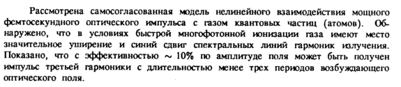 Рассмотрена самосогласованная модель нелинейного взаимодействия мощного фемтосекундного оптического импульса с газом квантовых частиц (атомов). Обнаружено, что в условиях быстрой многофотонной ионизации газа имеют место значительное уширение и синий сдвиг спектральных линий гармоник излучения. Показано, что с эффективностью ~ 10% по амплитуде поля может быть получен импульс третьей гармоники с длительностью менее трех периодов возбуждающего оптического поля.