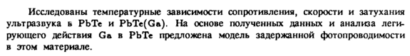 Исследованы температурные зависимости сопротивления, скорости и затухания ультразвука ь РЪТе и PbTc(Ga). На основе полученных данных и анализа легирующего действия Ga в РЪТе предложена модель задержанной фотопроводимости в этом материале.