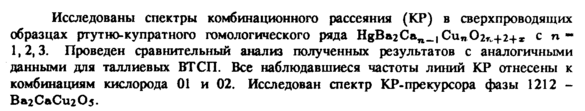 Исследованы спектры комбинационного рассеяния (КР) в сверхпроводящих образцах ртутно-купратного гомологического ряда HgBa2Can_|Cu*02«,+2+* с n-1, 2,3. Проведен сравнительный анализ полученных результатов с аналогичными данными для таллиевых ВТ СП. Все наблюдавшиеся частоты линий КР отнесены к комбинациям кислорода 01 и 02. Исследован спектр КР-прекурсора фазы 1212 -Ва2СаСи205.