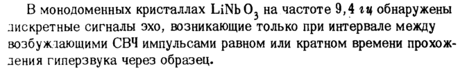 В монодоменных кристаллах LiNb03 на частоте 9,4 гц обнаружены дискретные сигналы эхо, юзникающие только при интервале между возбуждающими СВЧ импульсами равном или кратном времени прохождения гиперзвука через образец.