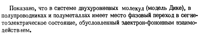 Показано, что в системе двухуровневых молекул (модель Дике), в полупроводниках и полуметаллах имеет место фазовый переход в сегне-то электрическое состояние, обусловленный электрон-фононным взаимодействуем.