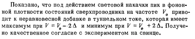 Показано, что под действием световой накачки пик в фонон-ной плотности состояний сверхпроводника на частоте Vo приводит к неравновесной добавке в туннельном токе, которая имеет максимум при V = ^= 2 Δ и минимум при V = V +2Δ. Получено качественное согласие с экспериментом на свинце.