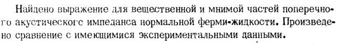 Найдено выражение для вещественной и мнимой частей поперечно» го акустического импеданса нормальной ферми-жидкости. Произведено сравнение с имеющимися экспериментальными данными.