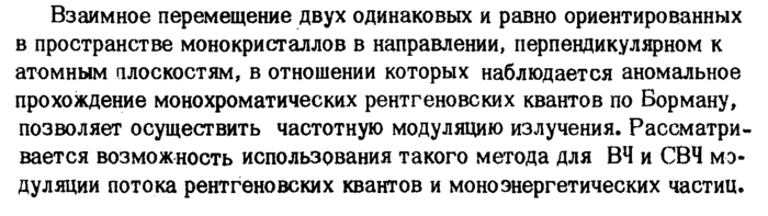 Взаимное перемещение двух одинаковых и равно ориентированных в пространстве монокристаллов в направлении, перпендикулярном к атомным плоскостям, в отношении которых наблюдается аномальное прохождение монохроматических рентгеновских квантов по Борману, позволяет осуществить частотную модуляцию излучения. Рассматривается возможность использования такого метода для ВЧ и СВЧ модуляции потока рентгеновских квантов и моноэнергетических частиц.