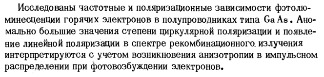 Исследованы частотные и поляризационные зависимости фотолюминесценции горячих электронов в полупроводниках типа GaAs. Аномально большие значения степени циркулярной поляризации и появление линейной поляризации в спектре рекомбинационного. излучения интерпретируются с учетом возникновения анизотропии в импульсном распределении при фотовозбуждении электронов.