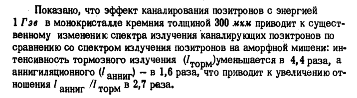 Показано, что эффект каналирования позитронов с энергией 1 Гзв в монокристалле кремния толщиной 300 мкм приводит к существенному изменению спектра излучения каналирующих позитронов по сравнению со спектром излучения позитронов на аморфной мишени: интенсивность тормозного излучения (/ТОрМ)уменьшается в 4,4 раза, а аннигиляционного (/анниг) в 1>6 раза, что приводит к увеличению отношения / анниг // торм в 2,7 раза.