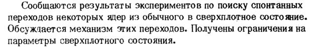 Сообщаются результаты экспериментов по поиску спонтанных переходов некоторых ядер из обычного в сверхплотное состояние. Обсуждается механизм этих переходов.» Получены ограничения на параметры сверхплотного состояния.