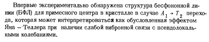 Впервые экспериментально обнаружена структура бесфононной линии (БФЛ) для примесного центра в кристалле в случае А^-* Т2 перехода, которая может интерпретироваться как обусловленная эффектом Яна -Теллера при наличии слабой вибронной связи с псевдолокальными колебаниями.