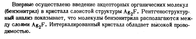 Впервые осуществлено введение акцепторных органических молекул (бензонитрил) в кристалл слоистой структуры Ag2F. Рентгеиоструктур-ный анализ показывает, что молекулы бензонитрила располагаются между слоями Ag2F. Интеркалированный кристалл обладает высокой проводимостью.