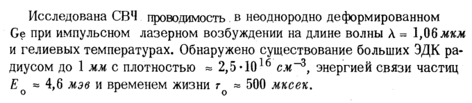 Исследована СВЧ проводимость в неоднородно деформированном Ge при импульсном лазерном возбуждении на длине волны λ = 1,06 мкм и гелиевых температурах. Обнаружено существование больших ЭДК радиусом до 1 мм с плотностью « 2,5-1016 см~^, энергией связи частиц Ε о » 4,6 мэв и временем жизни го » 500 мксек.