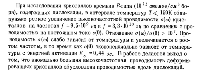 При исследовании кристаллов кремния Р-типа (10 13 атомов/смь бора), содержащих дислокации, в интервале температур Г< 150К обнаружено резкое увеличение высокочастотной проводимости σ{ω) кристаллов на частотах / =9,5-Ю9 ъц и / =3,3-10 10 гц по сравнению с проводимостью на постоянном токе σ(0). Отношение σ(ω)/σ(0) > 107. Проводимость σ(ω) слабо зависит от температуры и увеличивается с ростом частоты, в то время как σ{0) экспоненциально зависит от температуры с энергией активации EQ =0,44 эв. В работе делается вывод о том, что аномально большая высокочастотная проводимость деформированных кристаллов обусловлена проводимостью вдоль дислокаций.