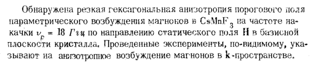 Обнаружена резкая гексагональная анизотропия порогового поля параметрического возбуждения магноков в CsMnF* на частоте накачки = 18 Ггц по направлению статического поля Η в базисной плоскости кристалла. Проведенные эксперименты, по-видимому, указывают на анизотропное возбуждение магнонов в к-пространстве,.