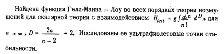 Найдена функция Гелл-Манна Лоу во всех порядках теории возмущений для скалярной теории с взаимодействием .Щ = gfjjL* dDx для η! п -»оо у D = -—2— 2. Исследованы ее ультрафиолетовые точки ста-п 2 бильности.