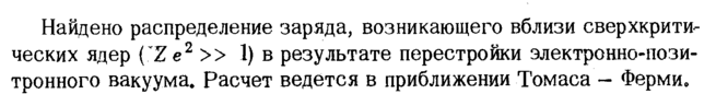 Найдено распределение заряда, возникающего вблизи сверхкритических ядер (Те2 >> 1) в результате перестройки электронно-пози-тронного вакуума. Расчет ведется в приближении Томаса Ферми,