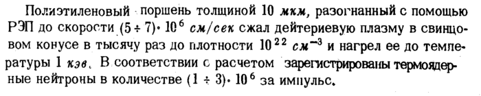 Полиэтиленовый поршень толщиной 10 мкм, разогнанный с помощью РЭП до скорости (5* 7)· ДО6 см/сек сжал дейтериевую плазму в свинцовом конусе в тысячу раз до плотности 10 22 см~3 и нагрел ее до температуры 1 %эв, В соответствии с расчетом зарегистрированы термоядерные нейтроны в количестве (1 τ 3)· 10 6 за импульс.