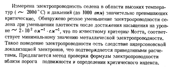 Измерена электропроводность селена в области высоких температур ( <~ 2000 4 С) и давлений (до 1000 атм) значительно превышающих критические. Обнаружено резкое уменьшение электропроводности селена при уменьшении плотности после достижения насыщения на уровне ^ 2· 102 ом-1 -см~1, что по известному критерию Мотта, соответствует минимальному значению металлической электропроводности. Такое поведение электропроводности есть следствие андерсоновской локализацией электронов, что подтверждается приведенными расчетами. Предлагается метод проверки формулы электропроводности вблизи порога подвижности и определении критического индекса.