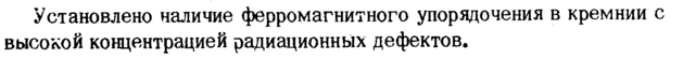 Установлено наличие ферромагнитного упорядочения в кремнии с высокой концентрацией радиационных дефектов.