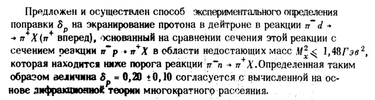 Предложен и осуществлен способ экспериментального определения поправки δρ на экранирование протона в дейтроне в реакции π~ d ■* -» π·+^(ττ+ вперед), основанный на сравнении сечения этой реакции с сечением реакции тГр ♦ п*Х в области недостающих масс 1,4ЪГэв2, которая находится ниже порога реакции У~п -> π+X. Определенная таким образом величина δρ = 0,20 +0,10 согласуется с вычисленной на основе дифракционной теории многократногр рассеяния.