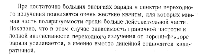 При достаточно больших энергиях заряда в спектре переходного излучения появляются очень жесткие кврнты» для которых мнимая часть поляризуемости среды больше действительной части, Показано, что в этом случае зависимость граничной частоты и полной интенсивности переходного излучения от лорпш-ф^морг заряда усиливается, а именно вместо линейной становится квадратичной,