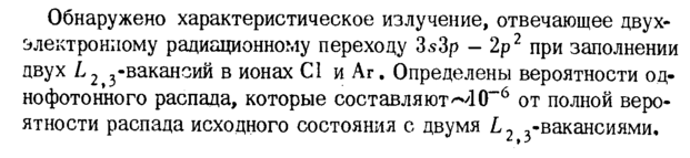 Обнаружено характеристическое излучение, отвечающее двух-электрошюму радиационному переходу 3s3p 2р2 при заполнении двух £2>3-вакансий в ионах С1 и Аг. Определены вероятности од-нофотонного распада, которые составляют'-'Ю-6 от полной вероятности распада исходного состояния с двумя L2 3-вакансиями.
