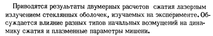 Приводятся результаты двумерных расчетов сжатия лазерным излучением стеклянных оболочек, изучаемых на эксперименте. Обсуждается влияние разных типов начальных возмущений на динамику сжатия и плазменные параметры мишени.
