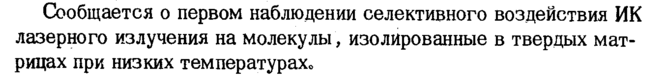 Сообщается о первом наблюдении селективного воздействия ИК лазерного излучения на молекулы , изолированные в твердых матрицах при низких температурахо