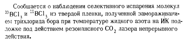 Сообщается о наблюдении селективного испарения молекул 10ВС1Я и ПВС13 из твердой пленки, полученной замораживанием трйхлорида бора при температуре жидкого азота на ИК подложке под действием резонансного С02 лазера непрерывного действия.
