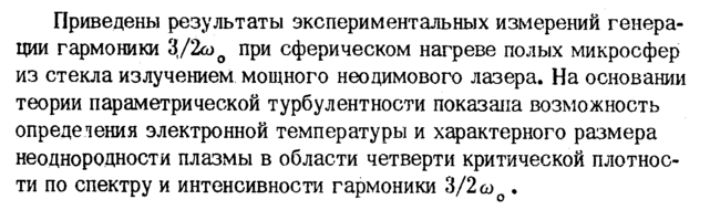 Приведены результаты экспериментальных измерений генерации гармоники 3/2ωο при сферическом нагреве полых микросфер из стекла излучением мощного неодимового лазера. На основании теории параметрической турбулентности показала возможность опредечения электронной температуры и характерного размера неоднородности плазмы в области четверти критической плотности по спектру и интенсивности гармоники 3/2 ω .