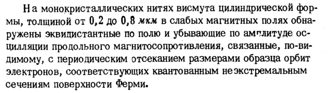 На монокристаллических нитях висмута цилиндрической формы, толщиной от 0,2 до 0,8 мкм в слабых магнитных полях обнаружены эквидистантные по полю и убывающие по амплитуде осцилляции продольного магнитосопротивления, связанные, по-видимому, с периодическим отсеканием размерами образца орбит электронов, соответствующих квантованным неэкстремальным сечениям поверхности Ферми.