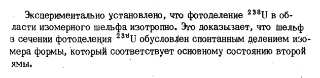 Экспериментально установлено, что фотоделение 238U в области изомерного шельфа изотропно. Это доказызает, что шельф в сечении фото деления 23*U обусловлен спонтанным делением изомера формы, который соответствует основному состоянию второй ямы.