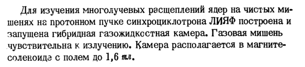 Для изучения многолучевых расщеплений ядер на чистых мишенях на протонном пучке синхроциклотрона ЛИЯФ построена и запущена гибридная газожидкостная камера. Газовая мишень чувствительна к излучению. Камера располагается в магните-соленоидз с полем до 1,6 «и.