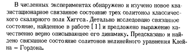 В численных экспериментах обнаружено и изучено новое квазистационарное связанное состояние трех солитоноз классического скалярного поля Хиггса. Детально исследовано связанное состояние, найденное в работе [ 1] и предложено выражение качественно верно описывающее его динамику. Предсказано и найдено связанное состояние солитонов нелинейного уравнения Клейна Гордона.
