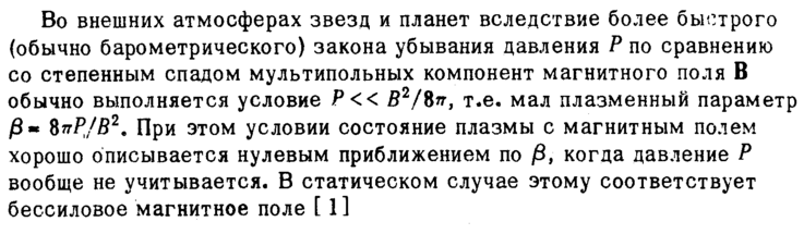 Во внешних атмосферах звезд и планет вследствие более быстрого (обычно барометрического) закона убывания давления Ρ по сравнению со степенным спадом мультипольных компонент магнитного поля В обычно выполняется условие Р<< В2/Ъп, т.е. мал плазменный параметр /3« 8яР/б2. При этом условии состояние плазмы с магнитным полем хорошо описывается нулевым приближением по β, когда давление Ρ вообще не учитывается. В статическом случае этому соответствует бессиловое магнитное поле [ 1]