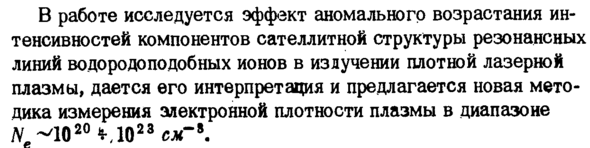 В работе исследуется эффект аномального возрастания ин-тенсивностей компонентов сателлитной структуры резонансных линий водородоподобных ионов в излучении плотной лазерной плазмы, дается его интерпретация и предлагается новая методика измерения электронной плотности плазмы в диапазоне