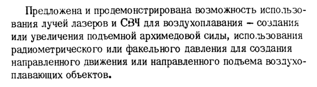 Предложена и продемонстрирована возможность использования лучей лазеров и С8Ч для воздухоплавания создания или увеличения подъемной архимедовой силы, использования радиометрического или факельного давления для создания направленного движения или направленного подъема возлухо-плавающих объектов.