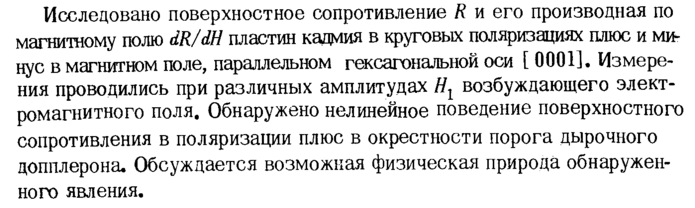 Исследовано поверхностное сопротивление R и его производная по магнитному полю dR/dH пластин кадмия в круговых поляризациях плюс и ми-нус в магнитном поле, параллельном гексагональной оси [ 0001]. Измерения проводились при различных амплитудах Нг возбуждающего электромагнитного поля. Обнаружено нелинейное поведение поверхностного сопротивления в поляризации плюс в окрестности порога дырочного допплерона. Обсуждается возможная физическая природа обнаруженного явления.