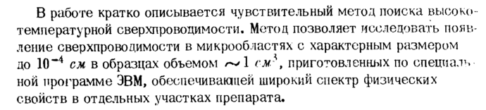 В работе кратко описывается чувствительный метод поиска высоко температурной сверхпроводимости. Метод позволяет исследовать появление сверхпроводимости в микрообластях с характерным размером до 10~4 см в образцах объемом 1 см*, приготовленных по специальной программе ЭВМ, обеспечивающей широкий спектр физических свойств в отдельных участках препарата.