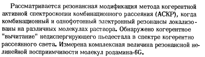 Рассматривается резонансная модификация метода когерентной активной спектроскопии комбинационного рассеяния (АСКР), когда комбинационный и однофотонный электронный резонансы локализованы на различных молекулах раствора. Обнаружено когерентное "вычитание" недиспергирующего пьедестала в спектре когерентно рассеянного света. Измерена комплексная величина резонансной нелинейной восприимчивости молекул родамина-6С