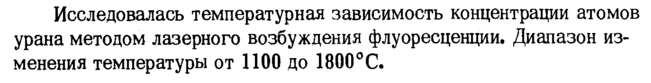 Исследовалась температурная зависимость концентрации атомов урана методом лазерного возбуждения флуоресценции. Диапазон изменения температуры от 1100 до 1800° С.